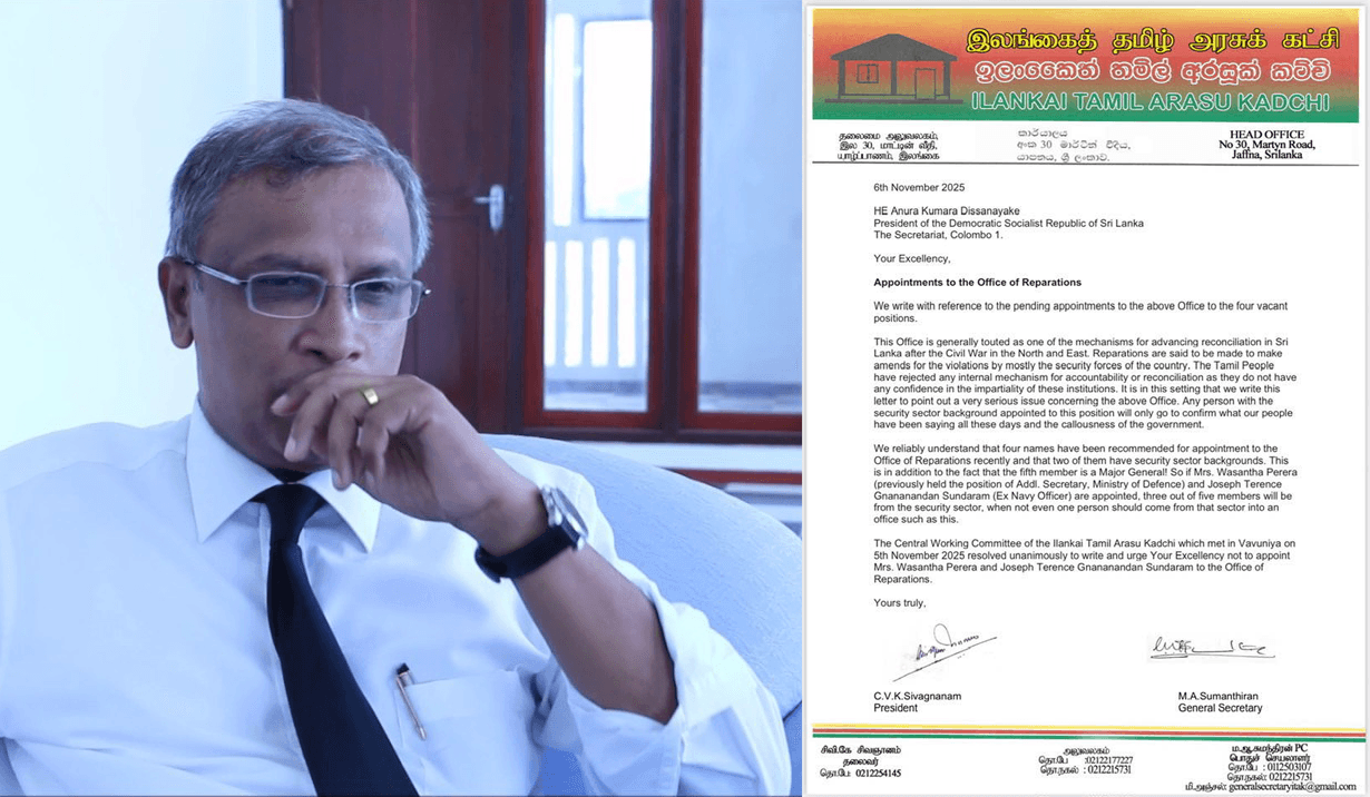 வவுனியாவில் நேற்று முன்தினம் கூடிய இலங்கைத் தமிழரசுக் கட்சியின் மத்திய செயற்குழு ஒருமனதாக தீர்மானித்து, பாதுகாப்பு த்துறையின் பின்ணியை கொண்ட வசந்தா பெரேரா மற்றும் ஜோசப் டெரன்ஸ் ஞானநந்தன் சுந்தரம் ஆகியோரையும் இழப்பீடு செய்யும் அலுவகத்திற்கு நியமிக்க வேண்டாம் என வலியுறுத்தி எழுத ஒருமனதாக தீர்மானம் மேற்கொண்டுள்ளோம் என கூறி தமிழரசு கட்சியின் செயலாளர் ஜனாதிபதிக்கு கடிதம் எழுதியுள்ளார்.