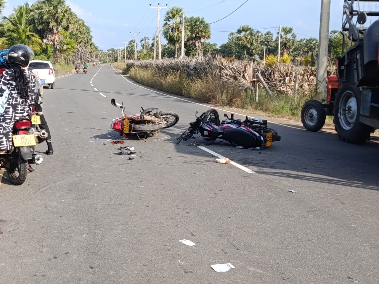 அதில் ஒரு மோட்டார் சைக்கிளில் பயணித்த மருதங்கேணி பிரதேச செயலக கணக்காளரும் சக உத்தியோகஸ்தரும் பயணித்துள்ளனர். மற்றைய மோட்டார் சைக்கிளில் ஓட்டியான பிறிதொரு நபருமாக மூவர் படுகாயமடைதுள்ளனர்.