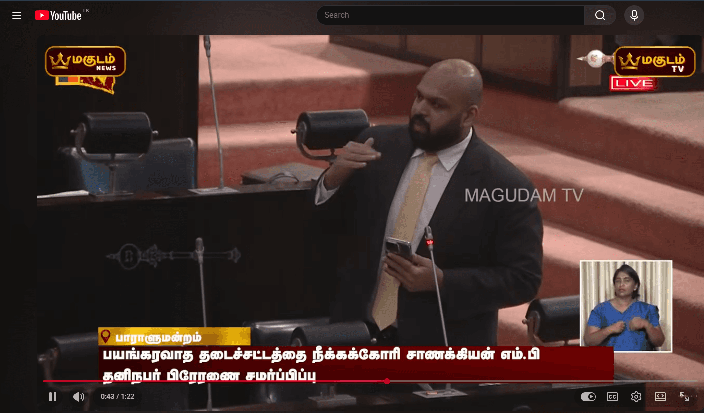 இலங்கையில் நீண்ட காலமாக நடைமுறையில் உள்ள பயங்கரவாத தடைச் சட்டம் ஜனநாயகத்துக்கும் மனித உரிமைகளுக்கும் எதிரானதாக இருப்பதாக சுட்டிக்காட்டி, அதனை முழுமையாக நீக்க வேண்டும் எனக் கோரி தனிநபர் சட்டமூலம் இன்று இரா.சாணக்கியன் அவர்களால் முன்வைக்கப்பட்டது.