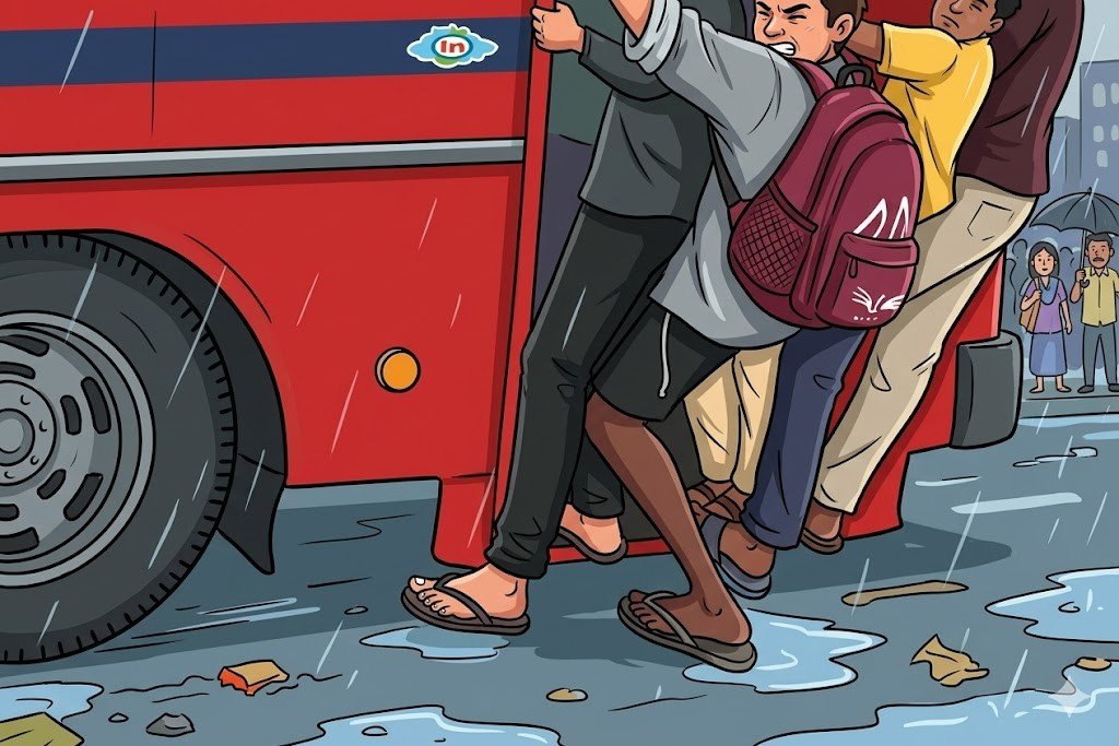குறித்த நபர் பேருந்தின் பின்பக்க கதவு வழியாக ஏறி மிதி பலகையிலேயே நின்றுகொண்டிருந்துள்ளார்.