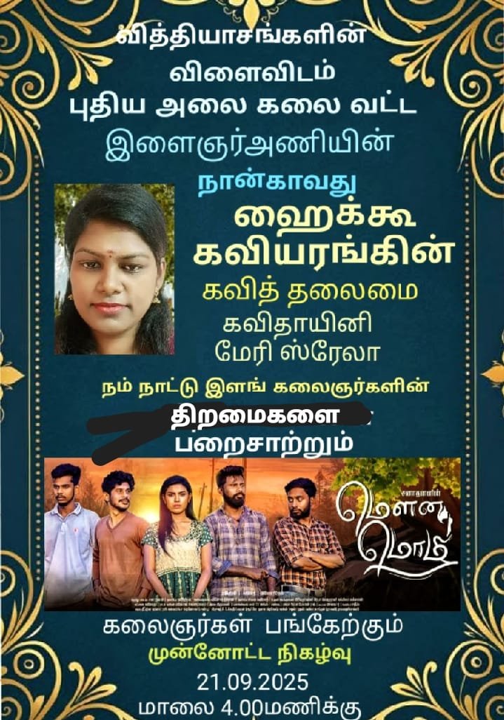 Read Moreசர்வதேச சமாதான தினமாகிய 21.09.2025 அன்று புதிய அலை கலை வட்ட இளைஞர் அணியினர் மாதாந்தம் நடத்தும் ஹைக்கூ கவியரங்கின் நான்காவது அமர்வு நடைபெறவுள்ளது.